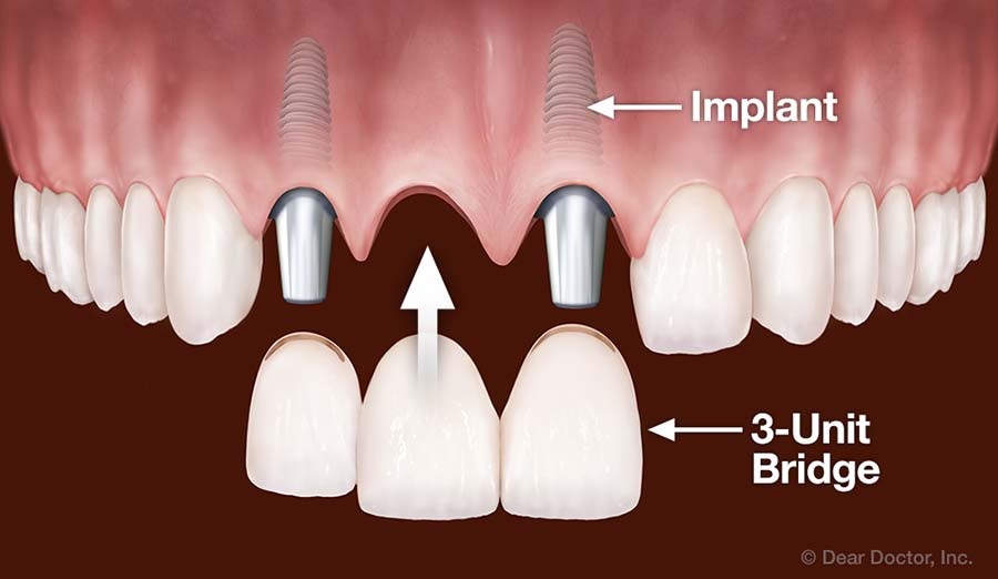 Replace Multiple Teeth — When you have more than one tooth missing, implants provide an ideal replacement mechanism. You don't even need one implant for every missing tooth. Instead, implant teeth can act as supports for fixed bridgework. For example, if you are missing three teeth in a row, we can place two implants, one on either side of the gap, and a crown in between that has no implant underneath. That way, you won't need to use any of your remaining natural teeth as bridge supports, which could weaken them and make them more susceptible to decay.