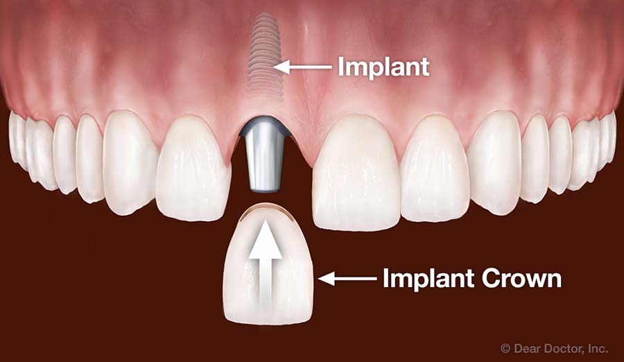 A dental implant most often takes the form of a small, screw-shaped titanium post that replaces the root-part of a missing tooth. The surgical procedure used to place an implant is actually quite minor and routine, requiring only local anesthesia in most cases. After a healing period, the implant is topped with a lifelike crown custom-made to match your existing natural teeth. Implants have a documented success rate of over 95%, which is significantly higher than any other tooth-replacement option.